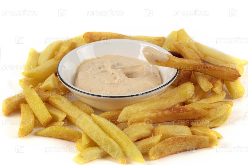 Тарелка картофеля-фри с белым соусом наверху.Картофель золотисто-коричневый и хрустящий.Белая чаша с голубым краем