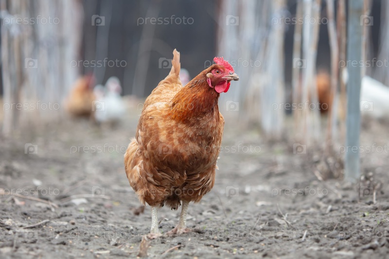 Красная курица ходит по земле на ферме