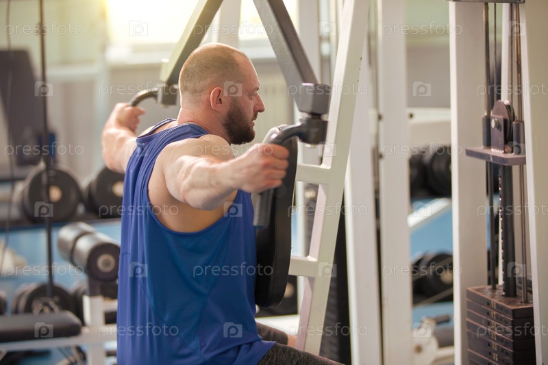 Спортсмен-мужчина тренируется на силовой машине в тренажерном зале
