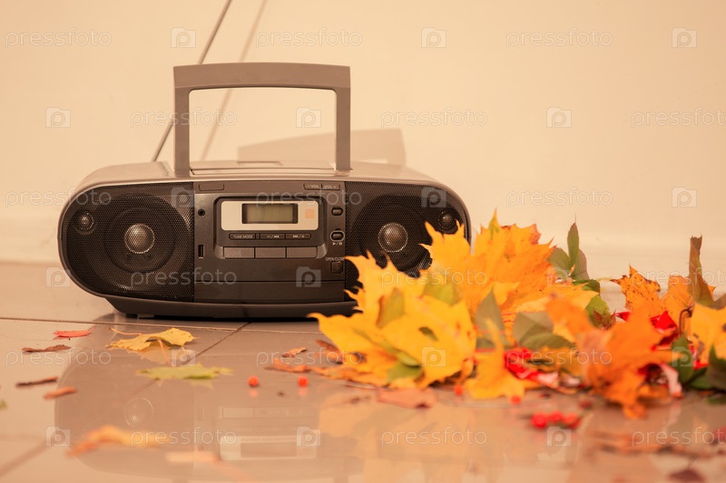 Ретро магнитофон с кучей осенних листьев бежевого оттенка. концепция памяти и старых воспоминаний