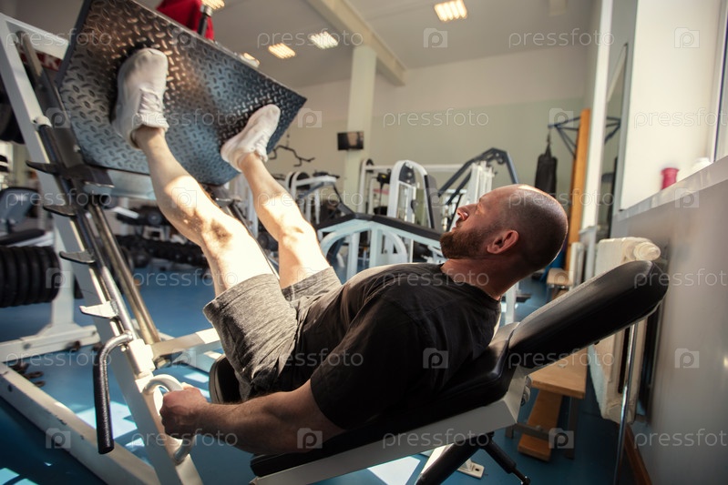 Мужчина тренируется в тренажерном зале с помощью пресс-машины для ног.Он носит шорты и черную футболку