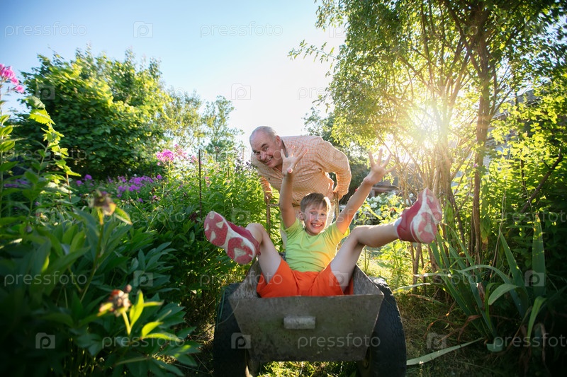 Дедушка видит своего внука в садовом вагоне летом.Счастливых летних каникул.Семья отдыхает на огороде