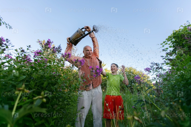 Счастливый дед и внук поливают цветы из горшка для орошения в саду