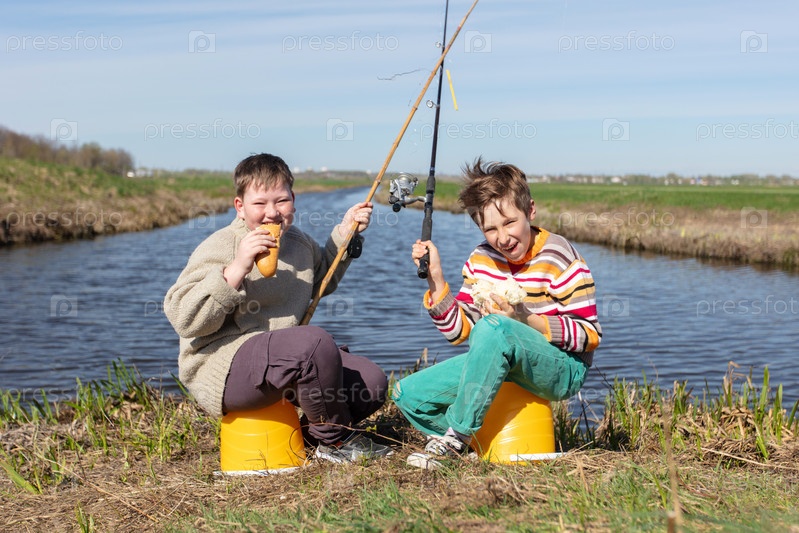 Мальчики заводили друзей во время рыбалки у реки, ели булочку и смеялись