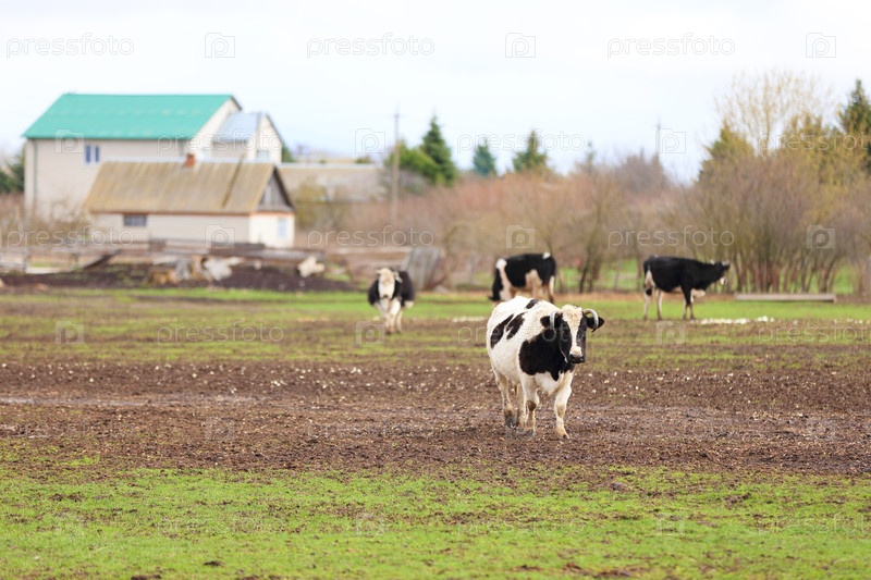 Корова гуляет по поле с другими коровами.Поле сухое и коричневое, а коровы пасутся