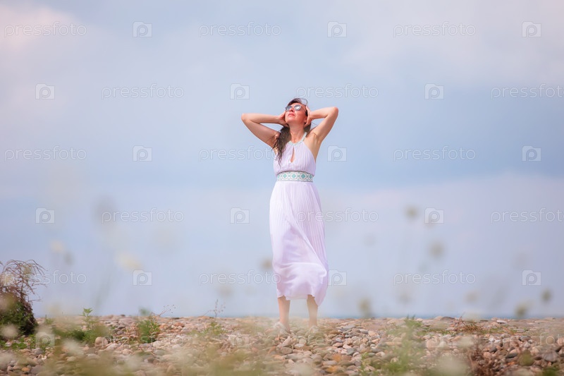 Женщина в белом платье смотрит на небо. Она носит солнцезащитные очки