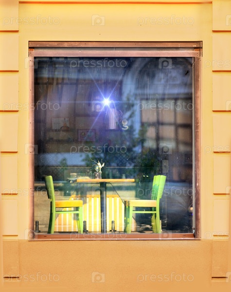 За окном находится интерьер кафе с двумя зелеными стульями и пустым столом перед ним