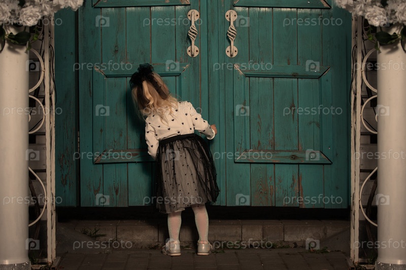 Маленькая девочка в черной юбке заглядывает сквозь трещину в двери.Сцена любопытная и игривая с винтажным тоном
