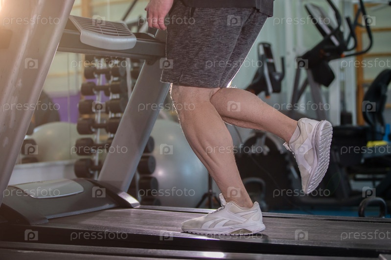 Мужчина бежит на беговой дорожке в спортзале.Мужчина в шортах и белой рубашке