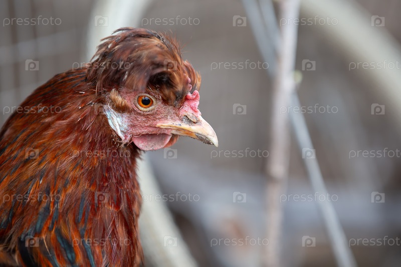 Курица с красной головой и белым пятном на лице.Курица смотрит в камеру