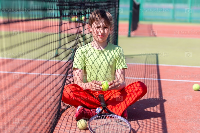 Мальчик-спортсмен возле теннисной сетки с ракетой и мячом.Детский спорт