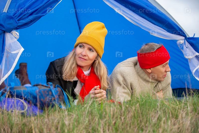 Активная пожилая пара отдыхает в палатке на фоне осеннего природного пейзажа