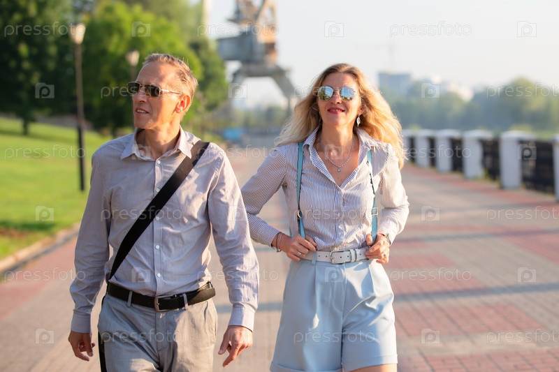 Взрослый мужчина и женщина, супружеская пара или туристы гуляют по городу и оглядываются
