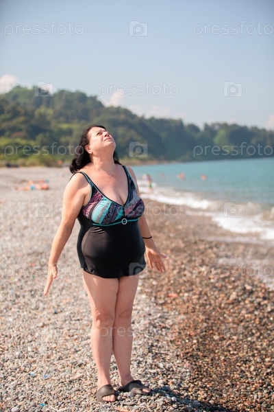 Пожилая женщина в купальнике занимается спортом и дыхательными упражнениями на пляже