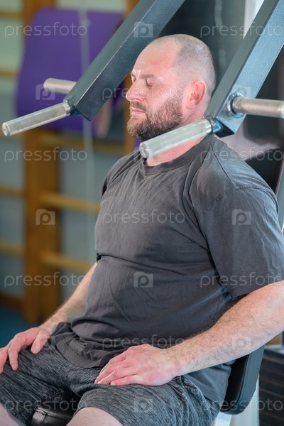 Мужчина сидит на скамейке тренажерного зала, одет в черную рубашку и серые шорты.Он находится в расслабленном состоянии, возможно медитирует или отдыхает после тренировки