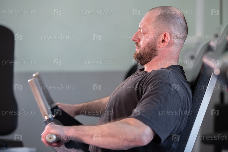 Человек сидит на скамейке с гантеликами в руке, одет в черную рубашку и сосредоточен на тренировках