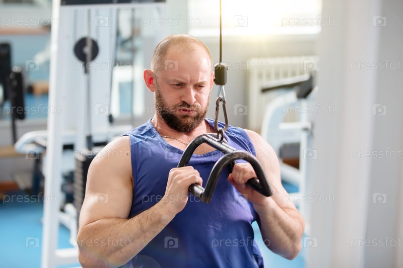 Мужчина работает в тренажерном зале, поднимает тяжести с помощью штанги.Он носит голубую крышку танка и сосредоточен на тренировках