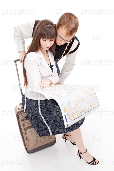 Туристы с картой и чемоданом изолированы на белом фоне