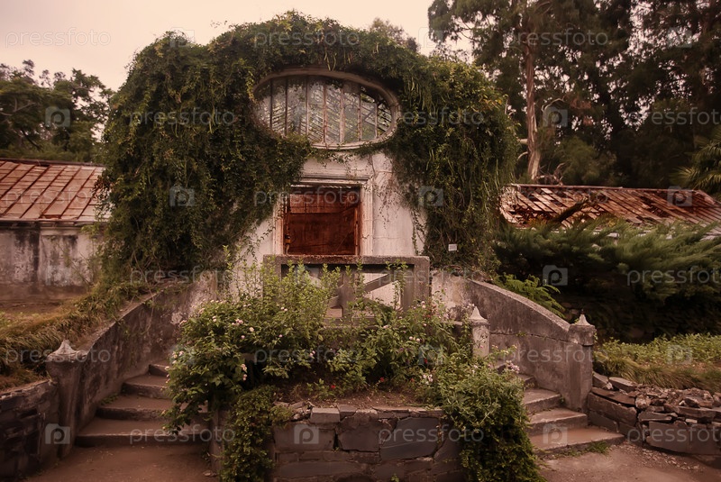 Винтажный дом перерос.Мистическое здание в старом парке.Ботанический сад