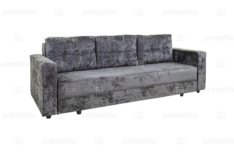 Серый диван с подушками из волоконной ткани, изолированный на белом фоне