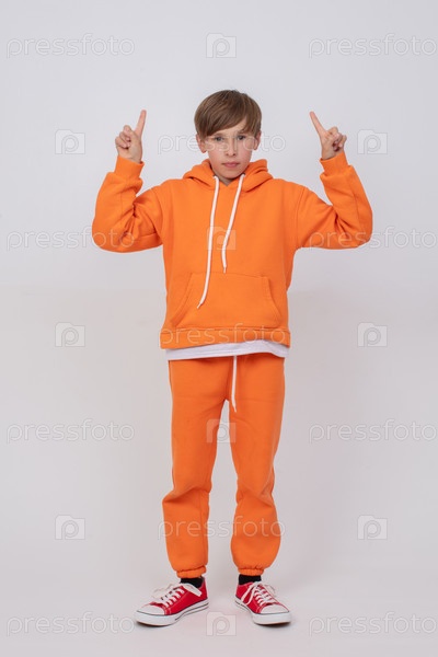 Мальчик в оранжевой куртке с капюшоном и оранжевых штанах поднимает два пальца и смотрит в камеру