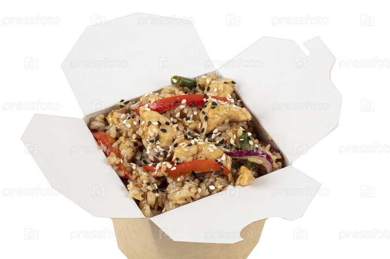 Вок с рисом в бумажной таре на белом фоне. китайская еда