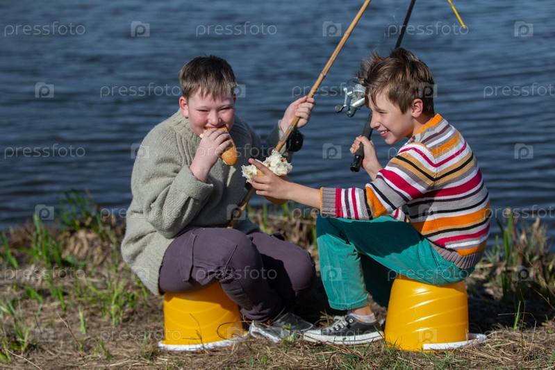 Мальчики заводили друзей во время рыбалки у реки, ели булочку и смеялись