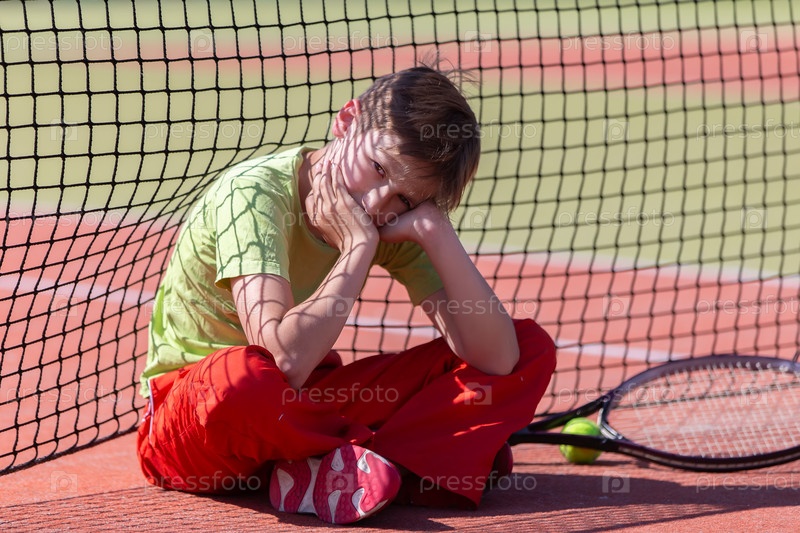 Мальчик проиграл соревнование по теннису.Ребенок сидит в сетке с ракетой.Психология спорта в детстве