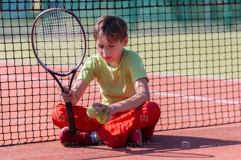 Мальчик проиграл соревнование по теннису.Ребенок сидит в сетке с ракетой.Психология спорта в детстве