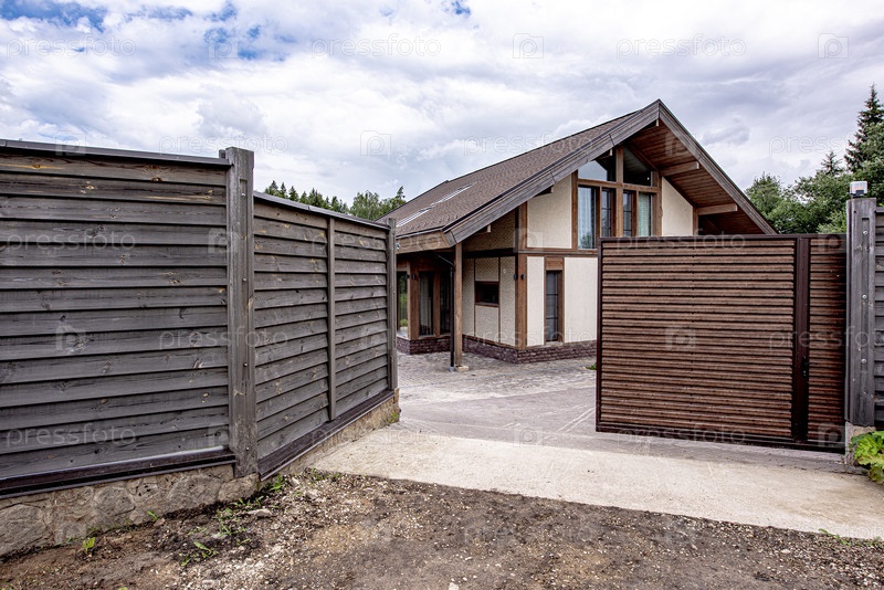 Двухэтажный загородный дом позади забора
