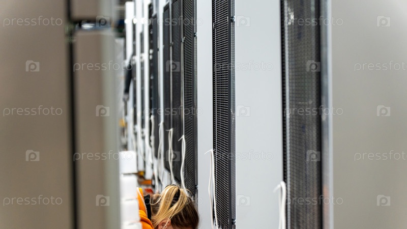 Женщина работает в центре обработки данных, с акцентом на плотные ряды серверных раков.Изображение отражает современную инфраструктуру и человеческий элемент управления ИТ