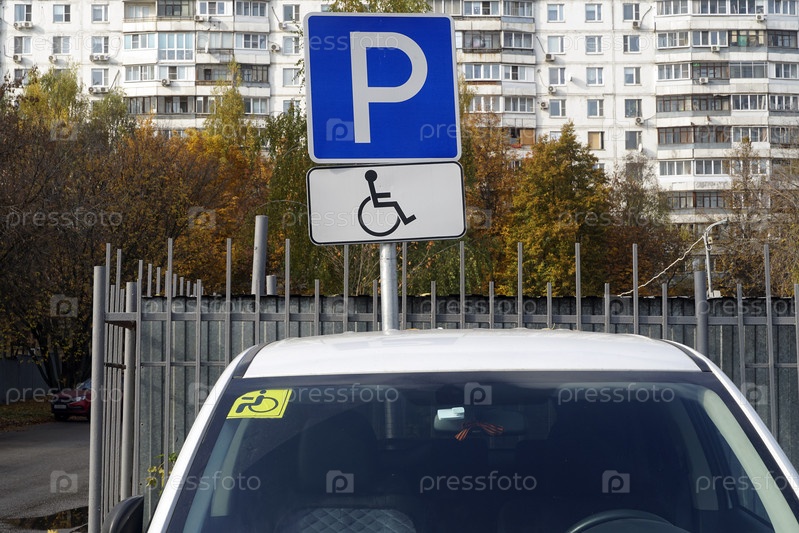 Дорожная надпись 'Парковка для инвалидов' и автомобиль-инвалид, припаркованный под ней