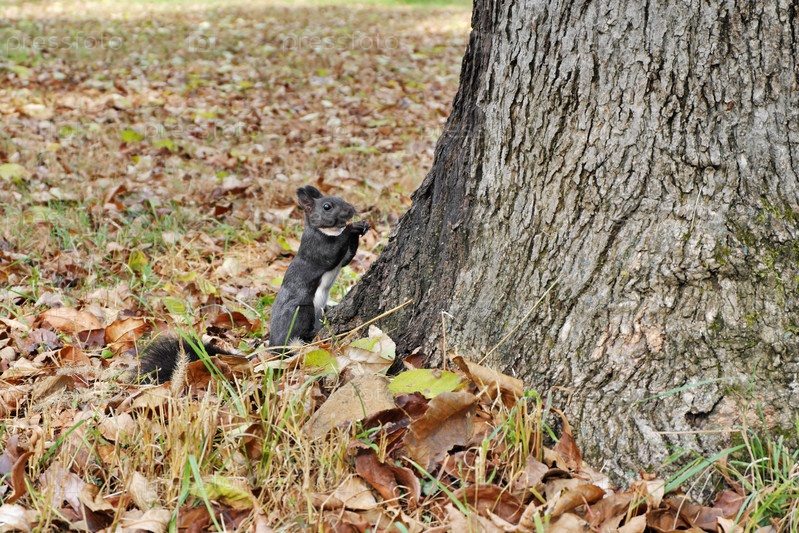 Милая белка с белой грудью возле ствола большого дерева среди падших осенних листьев