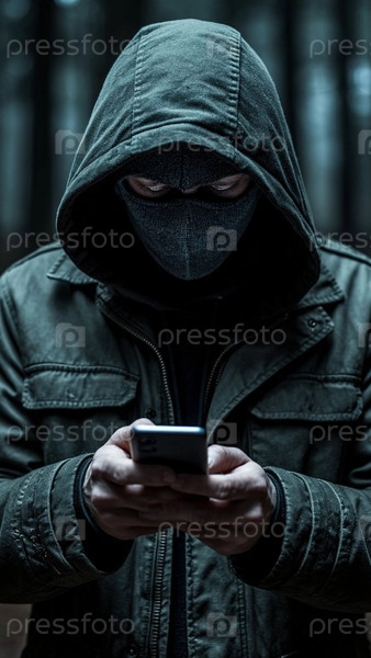 Подозрительный мужчина в маске держит телефон в руках