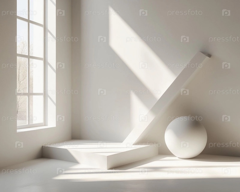Минималистский белый интерьер с солнечным светом и геометрическими формами. Пустой подиум у окна для презентации продукта