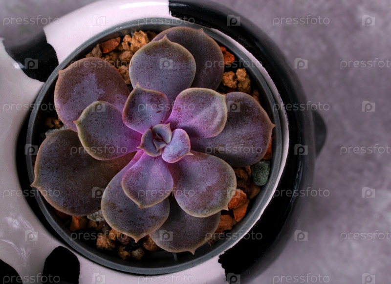 Purple echeveria succulent Pearl von Nuremberg в горшке на сером фоне Вид сверху