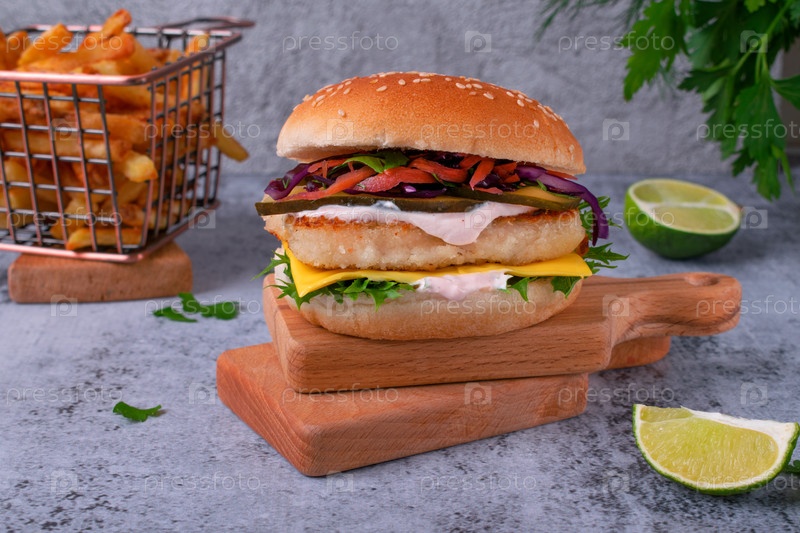 Рыбий гамбургер с полоковым филе, сыром из чеддера, колло-слоу и листьями салата на сером столе со картофелем фри на заднем плане