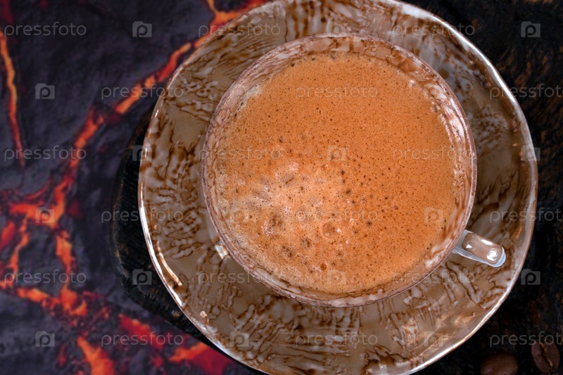 Черный кофе с пеной в коричневой керамической чашке на темном фоне