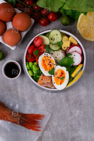 На сером столе подается миска с копченой рыбой, яйцами, овощами, бобами эдамаме и рисом.Здоровая сбалансированная диета с белой рыбой.Вид сверху