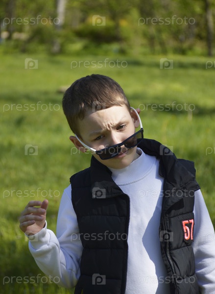 Мальчик стоит на зеленом поле в солнечный день.Ребенок слегка улыбается и отворачивается, создавая ощущение естественности и легкости