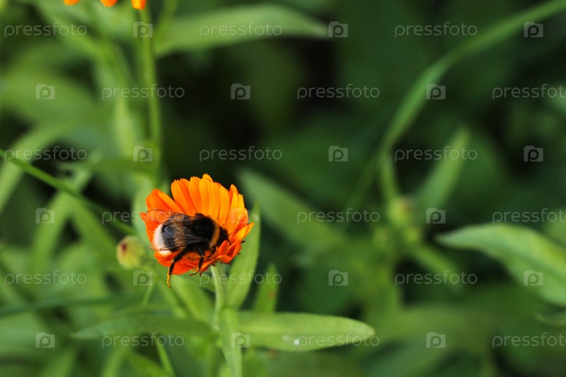 Бамбельби собирает нектар на цветке календулы в саду
