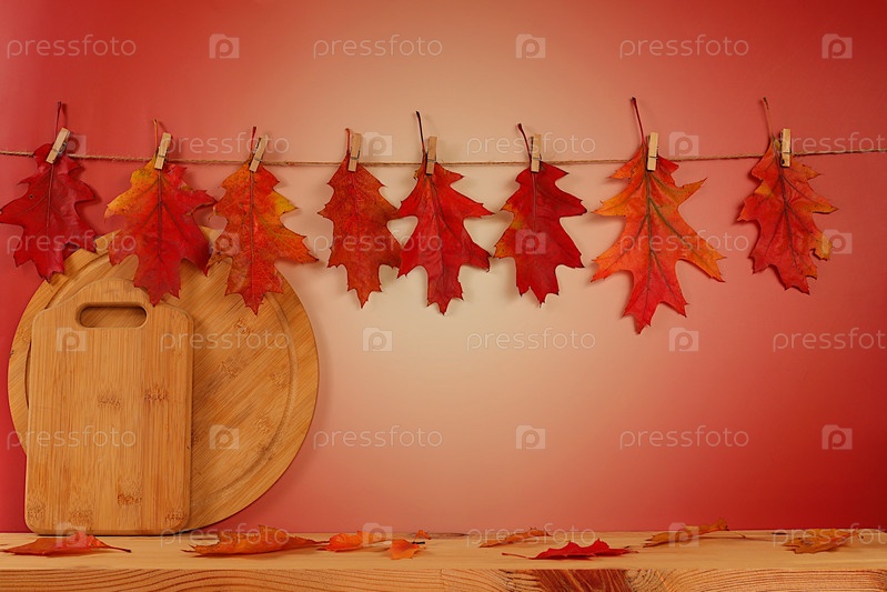 Пустая деревянная панель с кленовыми листьями на кухонном фоне, минималистская осенняя концепция, творческая осенняя композиция и баннер для отображения
