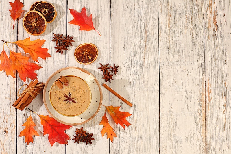 Сезонная абстрактная композиция с горячим осенним напитком, кофе со пеной, чай масала и упавшие листья, звездный анис и корица, баннер для экрана, концепция осеннего приветствия, макет меню