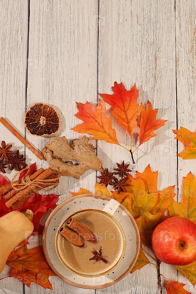 Сезонная абстрактная композиция с горячим осенним напитком, кофе со пеной и индийским чаем масала и упавшими листьями, звездным анисом и корицей, баннером экрана, концепцией осеннего приветствия, макетом меню