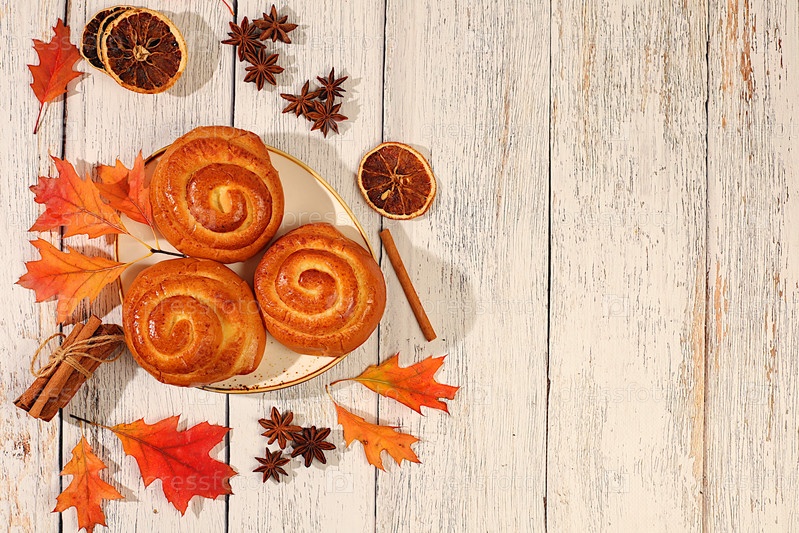 Коричневые булочки на деревянном столе с осенними выпавшими листьями, звездным анисом, имбирем и корицей, баннером или рисунком дисплея, концепцией приветствия осени, макетом меню и рекламой пекарни