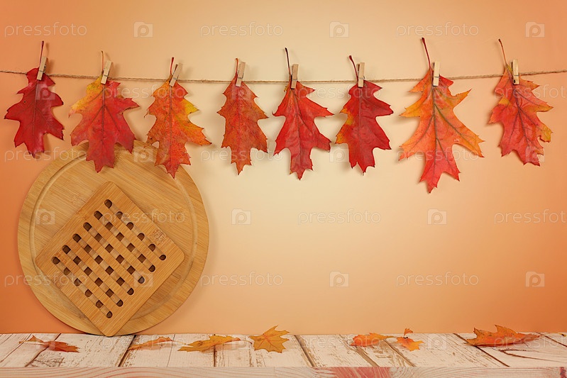 Осенняя абстрактная композиция с кленовыми листьями в вазе на элегантном современном кухонном столе, натюрморт и концепция Дня благодарения, сезонный фон и экрановый баннер, поздравительная открытка