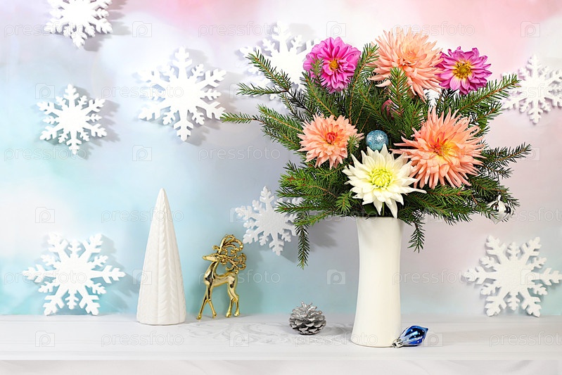 Рождественская и новогодняя планировка для дизайна и демонстрации продуктов, креативный рождественский букет свежих веток елей в вазе с цветами хризантемы и украшениями