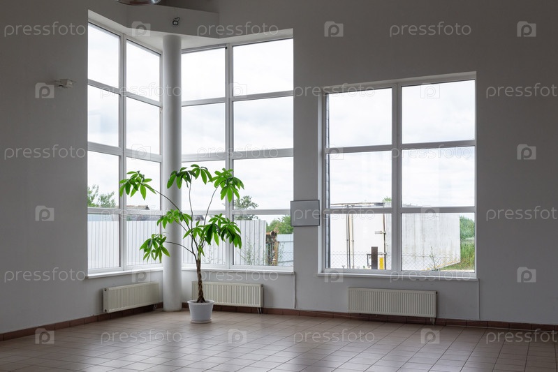 Просторная, яркая комната с высоким потолком, большими панелями и пышным зеленым растением на плиточном полу