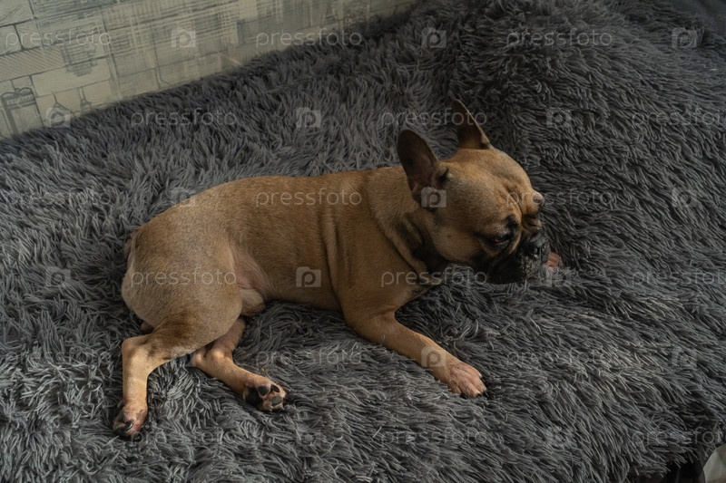 Французский бульдог тихо лежит на мягком сером текстильном одеяле, показывая спокойствие и легкость.Серенная осанка предполагает комфорт и расслабление в уютной атмосфере