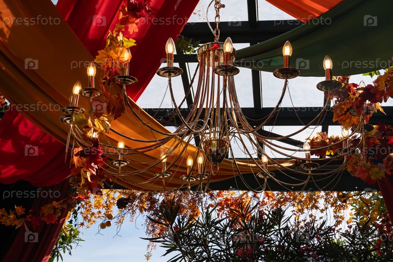 Элегантная люстра с теплым освещением, окруженная красочными осенними листьями и занавесками.Богатый дизайн люстры дополняет яркие сезонные украшения на выставке